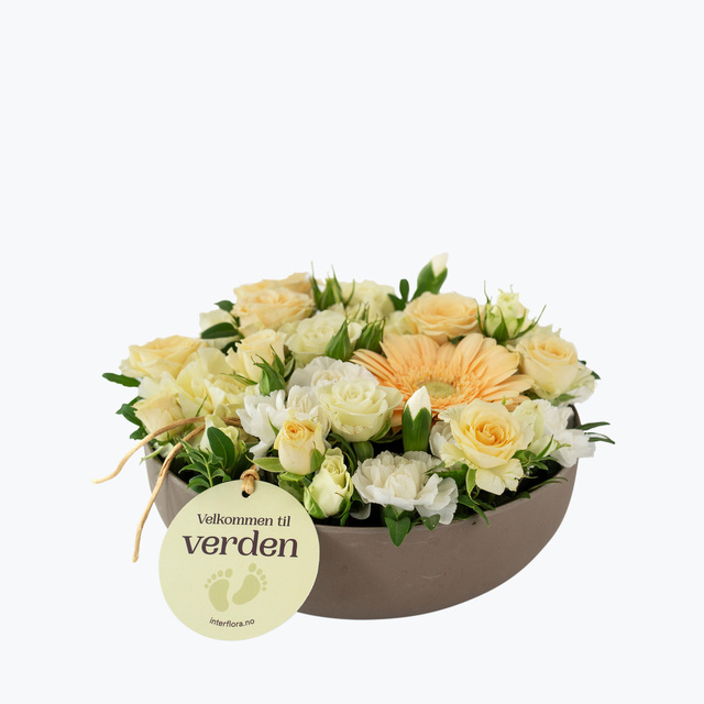 En nydelig dekorasjon i delikate lyse fargetoner med budskapet velkommen til verden. Sylinderskålen er miljøvennlig og produsert av nedbrytbare gjenbruksmaterialer. Enkelt å motta fordi den kan settes rett på bordet. Perfekt hilsen til nybakte foreldre.